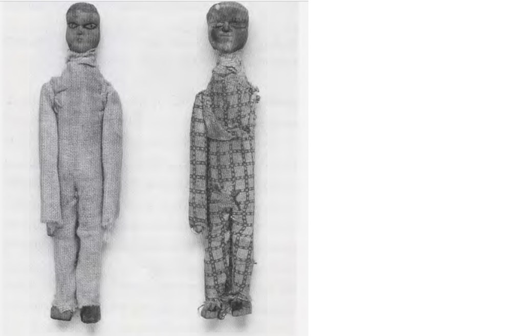Perhaps the most interesting part of their study focuses on the figures within the eight coffins in the museum’s collection. Given the uniform nature of the figures, with “a rigidly erect bearing with straight backs, and the contours of the lower half of their bodies are carefully formed to indicate tight knee breeches and hose, below which the feet are blackened to indicate ankle boots”, Menefee and Simpson opined that they were once a collection of model soldiers modified by the creator of the coffins. The figures had been edited in various ways before being added to the coffins – the backs of their heads darkened with black pigment to represent hair, their bodies carved to change the width and size of some of the dolls, with some even missing arms, presumably to better fit into their final resting place.