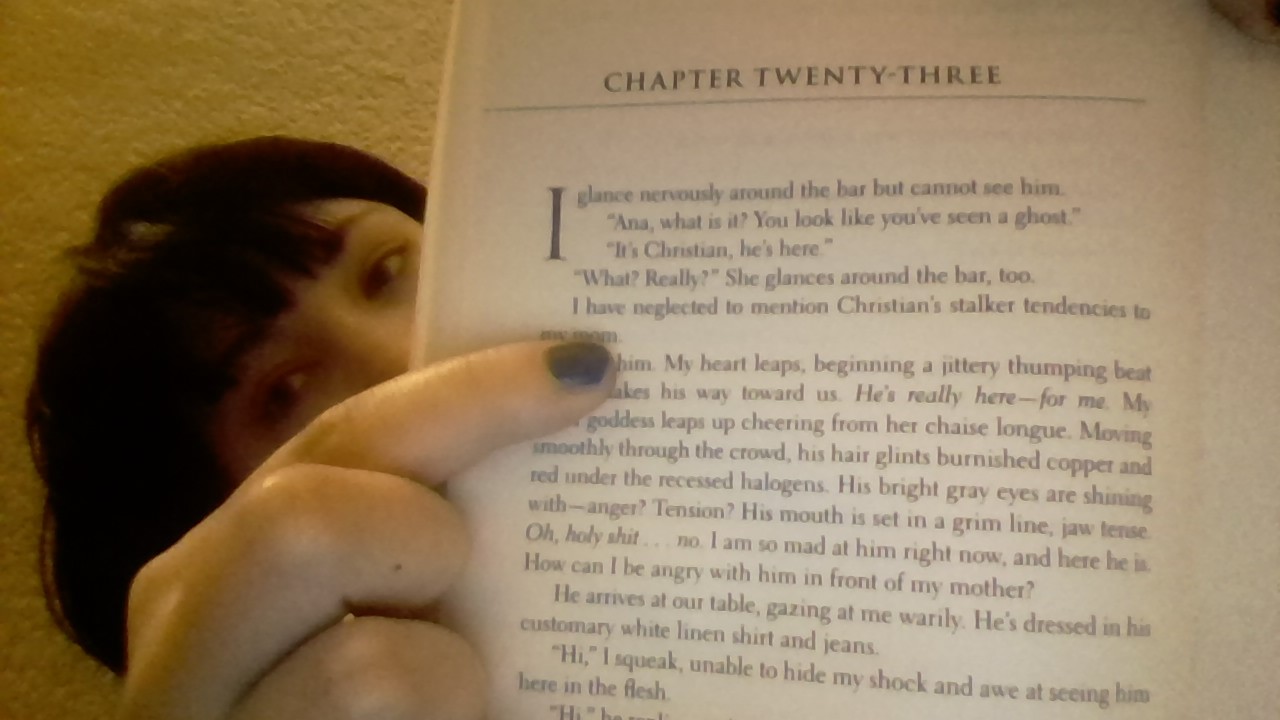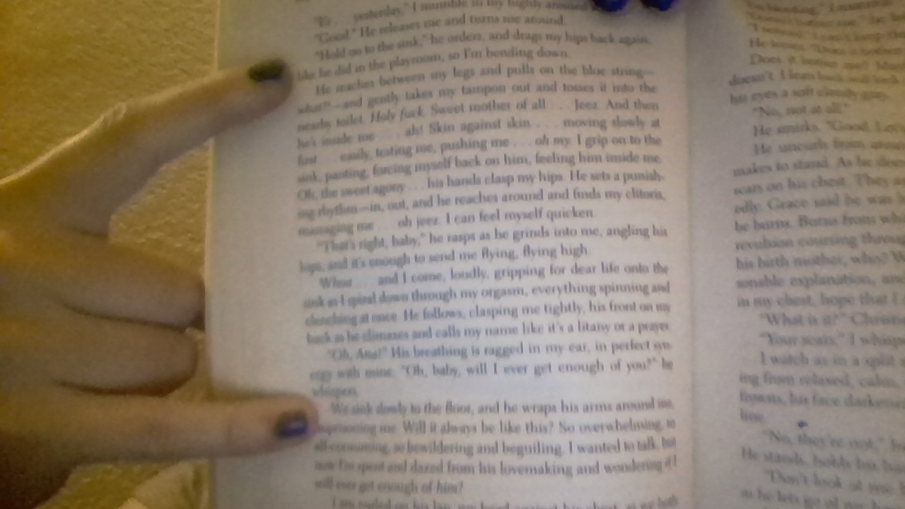 And, well, that just puts Christian in his place, doesn’t it? He gets all sad and ashen, and Ana immediately backtracks in her head, scolding herself with “it can’t be that bad, can it?”. He asks if she really hates it that much, and she’s like “I feel ambivalent about it. I don’t like it, but I don’t hate it.” Which…is not how you’ve felt for the rest of the book. Once again, has EL even aware of events that happened earlier in the story? Where Ana cried her eyes out because Christian “assaulted” her? Where Ana thought about their BDSM encounters as a matter of survival? Thank fuck there’s only a few pages left. Thank FUCK. Because this shit is so painfully inconsistent, so stupidly badly put-together, that sometimes I just want to give up writing forever and kill myself. If this is what people want, I will never be able to do this to them, because I was raised on the old-school, out-of-date methods like “character consistency” and “a coherent plot.”
